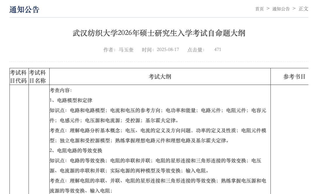 武汉纺织大学电子与电气工程学院发布了2026年硕士研究生入学考试自命题大纲。