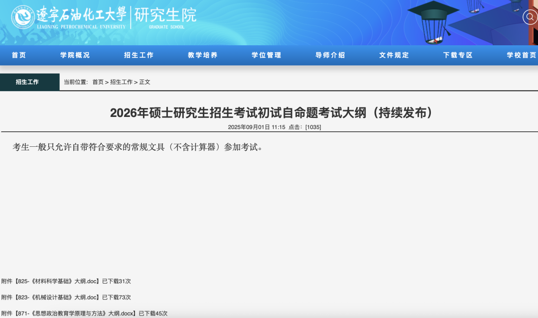辽宁石油化工大学发布了2026年硕士研究生招生考试初试自命题考试大纲(持续发布),并说明了考生一般只允许自带符合要求的常规文具(不含计算器)参加考试。