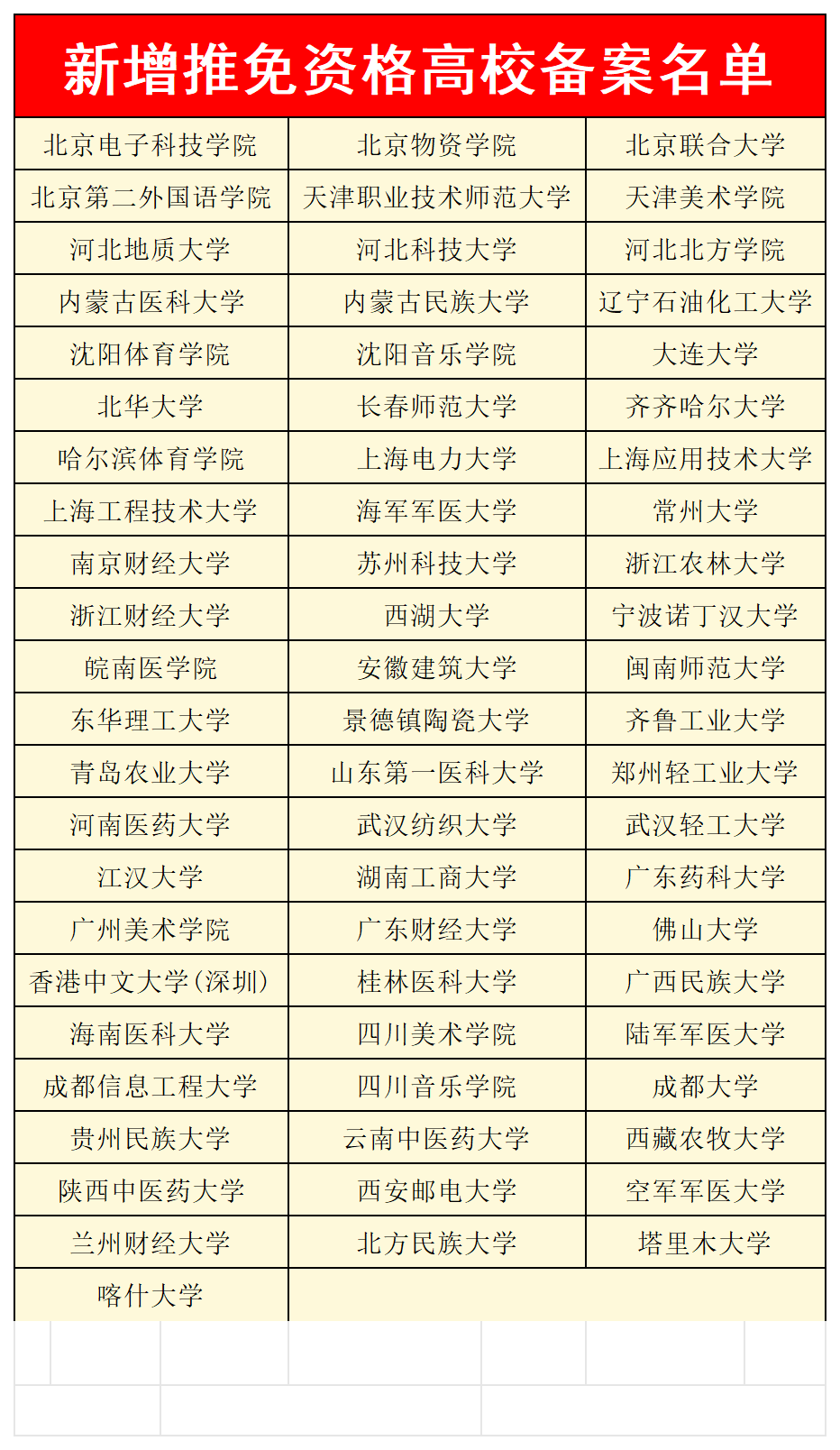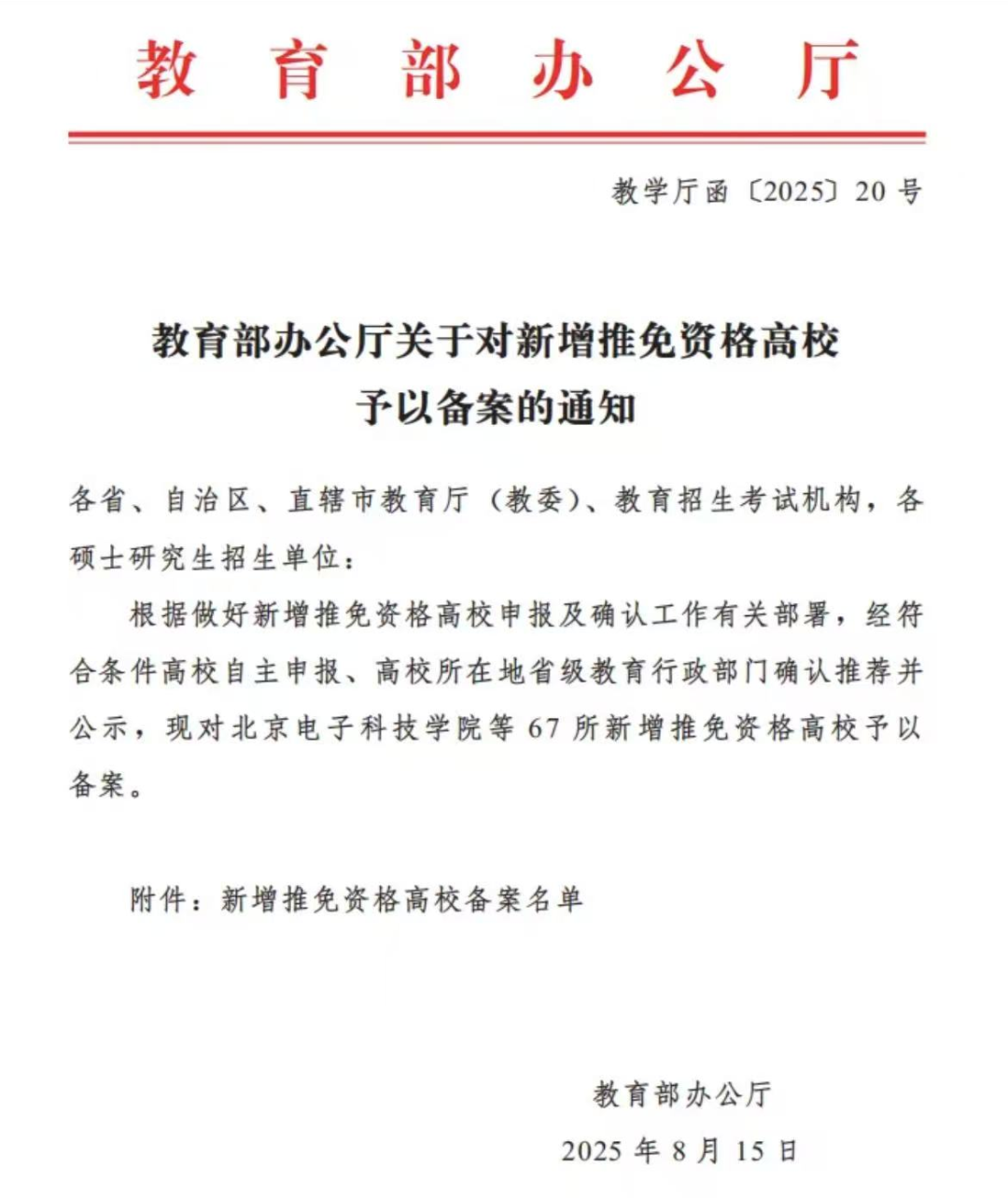 近日,教育部公布《关于对新增推免资格高校予以备案的通知》,根据做好新增推免资格高校申报及确认工作有关部署,经符合条件高校自主申报、高校所在地省级教育行政部门确认推荐并公示,现对北京电子科技学院等67所新增推免资格高校予以备案。