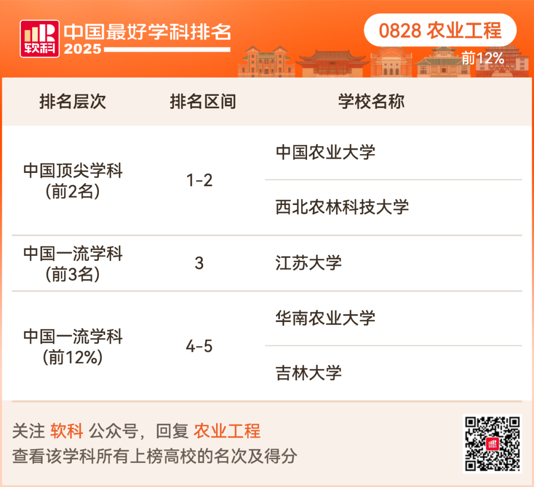 农业工程排名前12%的高校: