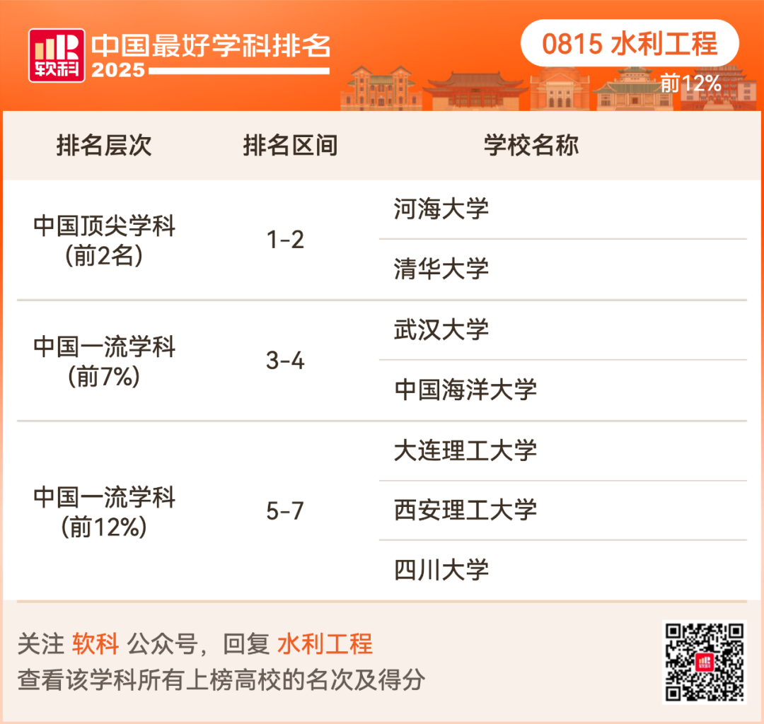 水利工程排名前12%的高校: