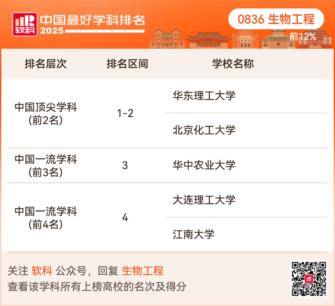 生物工程排名前12%的高校: