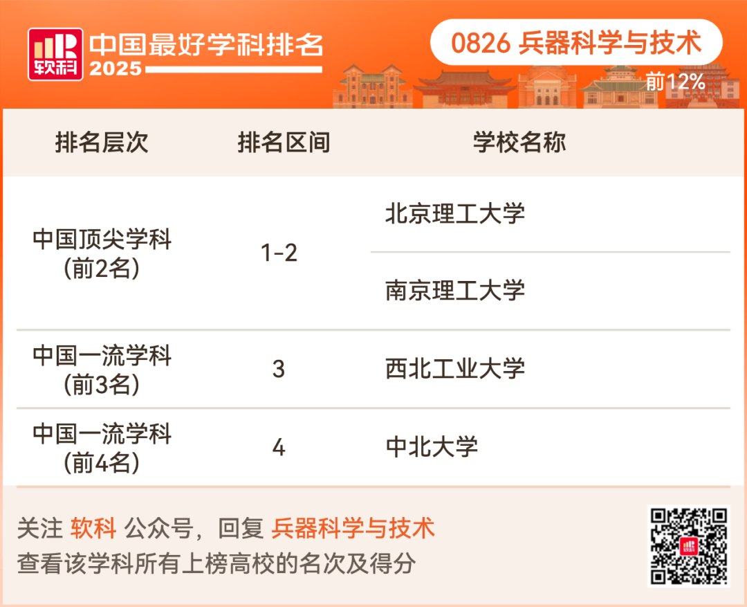 兵器科学与技术排名前12%的高校: