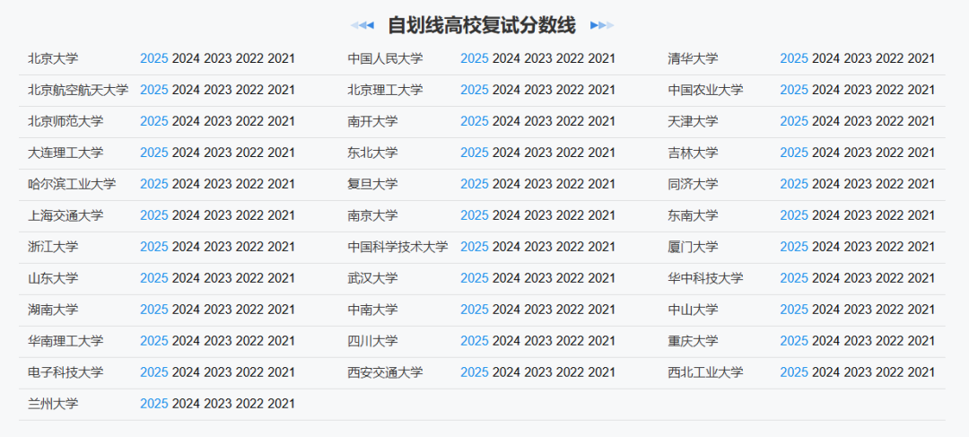 初试*(单科和总分)必须达到的基本要求,只有达到了这一分数标准,才能被招生单位接收复试和后续录取流程。总而言之,单科和总分都高于国家线,是进入复试的*基本门槛。北京、天津、河北、山西、辽宁、吉林、黑龙江、上海、江苏、浙江、安徽、福建、江西、山东、河南、湖北、湖南、广东、重庆、四川、陕西 内蒙古、广西、海南、贵州、云南、西藏、甘肃、青海、宁夏、新疆注:国家线分为A、B类,A类一般会比B类高5分。A、B类不是看你本科院校所在的区,而是看你报考院校所在的哪个区。是学校给出的一个能参加本校复试的线,可以用于校内调剂,一般会比院线分数低,相比之下院线更值得关注、更为重要。而且34 所自划线院校拥有自主划线权,分数线一般高于国家线,且公布时间更早,复试启动也快。在校线的基础上,各学院会根据学院整体招生情况确定院线。分数达到了院线,基本就可以进入复试,专业线基本和院线保持一致,会有极个别的特例。“专业线”通常指的是某个具体专业(或研究方向)的复试分数线。它是在院校线的基础上,由各学院或专业根据实际报考情况、招生计划、生源质量等因素,进一步划定的针对该专业的分数要求。因此,专业线 ≥ 院校线 ≥ 国家线。没过校线,但是过了A区国家线,可以在全国范围内选择符要求的调剂;没过校线,只过了B区国家线,没过A区国家线,只可以在B区院校调剂近5年国家线趋势图